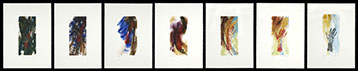 Niddah: Seven Days: Over the course of seven panels an overprinted image emerges both reaching out and inaccessible. The last print shows a complete hand in black against a watery background, a visual reference to the tradition of ritual immersion that marks the completion of Niddah.