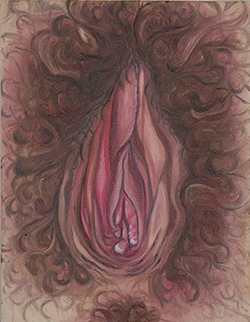 The painting, Vagina is a confrontation painting. Many people try to ignore the physical existence of the Vagina/Vulva in society. This part of a woman’s anatomy is seen as taboo, indecent, unimportant, and horrifying. Some women/girls have been shamed so much by society of the Vagina being “impure” or “dirty”, that they are afraid to even look at or touch themselves. The Vagina/Vulva is a beautiful part of a woman's body and is a natural part of our human existence. By painting the Vagina to be displayed for all to see is a way to confront the viewer and show them what this part of the body is and to try to dispel further stigma. The more we are exposed and educated about our bodies, the less negative stigma there will be.