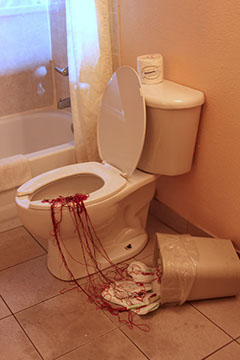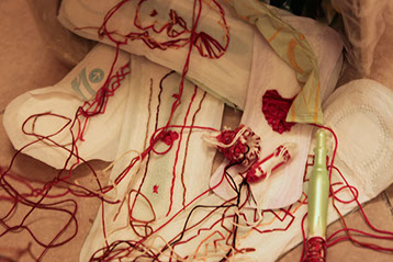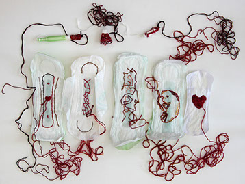 Threaded Together is a Site-Specific Installation work previously on view at a Howard Johnson Motel. This work symbolizes how all women have a common thread, being through menstruation. Each pad and tampon is stitched differently to show how each woman may feel about this cycle. Images range from loving, reproductive, to squiggle blobs interpreting these impressions on what menstruation symbolizes. The installation was placed with the toilet because this is where women go to change tampons and pads. The toilet is also where fortunate or unfortunate reproductive events may take place such as miscarriage or using a pregnancy test. No matter how a woman feels about reproduction, this is a cycle women all have in common. It is why women must empathize with one another and also celebrate despite what one’s personal beliefs may be.