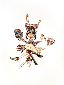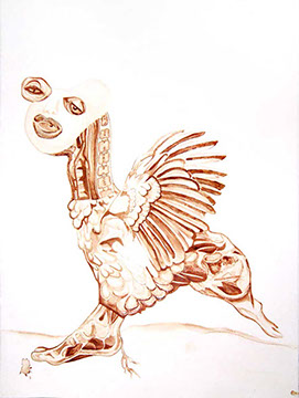 To consider menstrual blood an art medium is to acknowledge its natural pigmented elements. It is to praise the menstrual cycle as a means for creativity rather than anxiety. Human and animal bodily objects such as hair, feathers, and blood can be found in my work as an exploration of detachment. Once they’re separated from the being, these materials become purely object. Blood tends to represent outcomes of violence, yet there is tranquility involved in the release of menstruation. I am particularly captivated by the correlation of those beings who bleed cyclically and those who bleed forcefully. I hybridize fragments of humans, animals, and objects into impossible creatures who live in a world that knows no binary. Using the same palette amongst forms allows the dismembered limbs to form a newly birthed being.