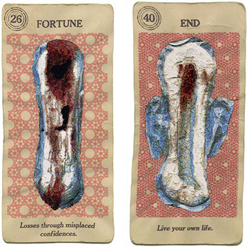 Although the individual pieces may be similar, there is a compulsion to see meaning into them. Akin to reading tarot cards, we may contemplate their messages to better understand the divinations of the female body. It is a funny, absurd exercise, imagining a world where the blood tells your fortune.