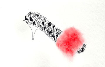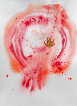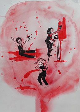 These images all feature the use of watercolour which has been allowed to flow and take its own direction, with minimum intervention from myself. I felt that this was appropriate as menstruation is a natural process which takes its own course. Four of the images are framed in an enclosed ‘womb-like’ space, with random flows of paint and water encircling other elements. My least favourite image is ‘She’s Got The Painters In’; but it illustrates an expression from Northern England- which I myself have only ever heard said by men (usually with a snigger). I decided to ‘re-appropriate’ this expression by making the ‘painters’ female rather than male. In the other images I have tried to portray a more ‘dream-like’ state with more positive connotations. It annoys me that men generally tend to ridicule women experiencing menstruation – yet without that process, new life could not be generated. Image 4: ‘Duality’ represents both the ‘glamorous’ side of being a woman and the more uncomfortable processes of menstruation and child birth.