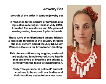 After exhibiting these pieces, I curated a St. Louis based exhibition, entitled Life Blood Exhibit, which traveled throughout the city and to Cape Girardeau, MO from 2011 - 2012. I have also continued to explore female reproductive health, with artworks themed around celebrating women’s bodies to addressing health concerns (my own and others’) to the political and social arena (abortion, birth control, the confiscation of tampons at a July 2013 Texas legislative meeting…).